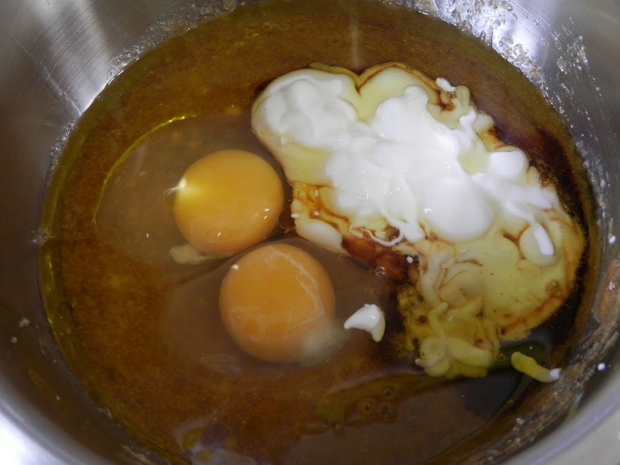Agrega a la mezcla los huevos, la vainilla, el yogur y el aceite.