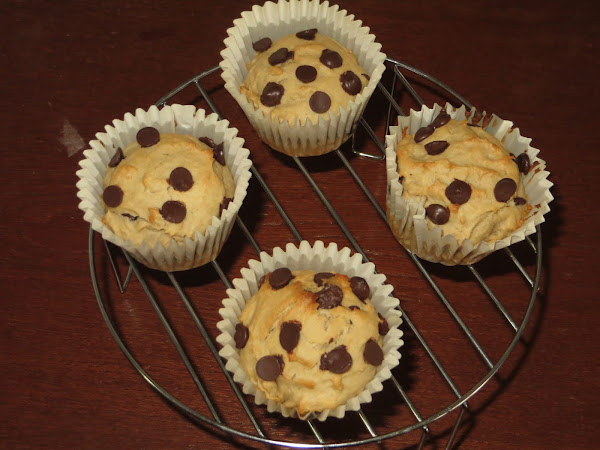 En un molde especial para hacer muffins vamos rellenado nuestras cápsulas, ya sabéis sólo 2/3 porque crecerán en el horno y ponemos más pepitas de chocolate por encima. Metemos al horno a 180º durante 25 minutos. Sacamos, dejamos enfriar y ya están listos para comer.