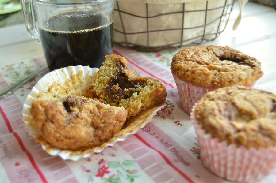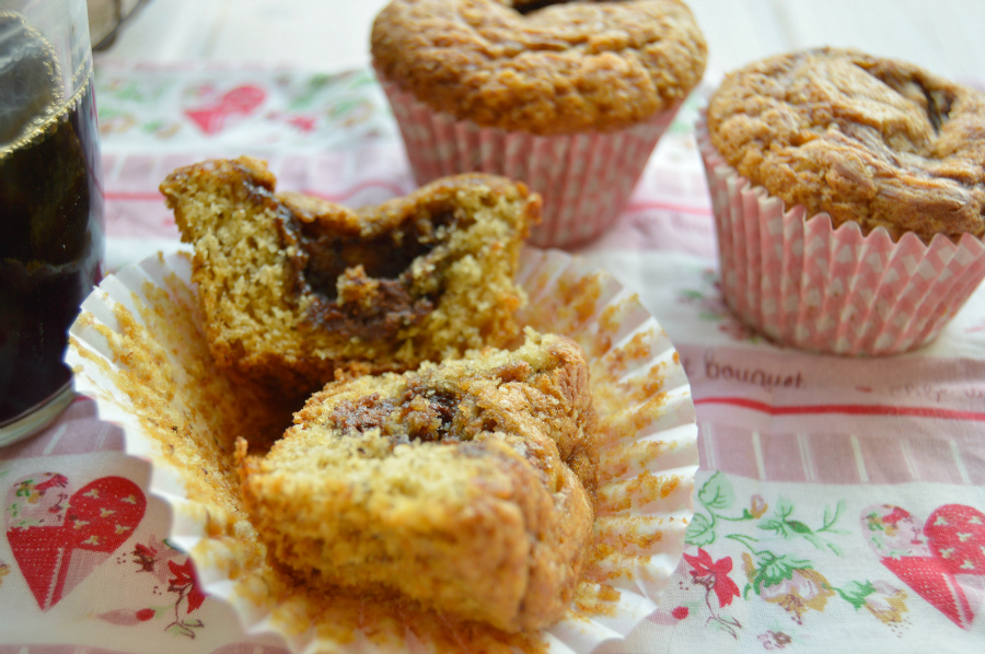 5. Repartimos la masa en las cápsulas de papel, procurando no llenarnos más de tres cuartas partes. En cada muffin, por encima, añadimos una cucharadita de crema de cacao. Con cuidado, con ayuda de un palillo o brocheta, mezclamos un poquito la nocilla, para que forme unas espirales, pero sin llegar a disolverse en la masa de los muffins.