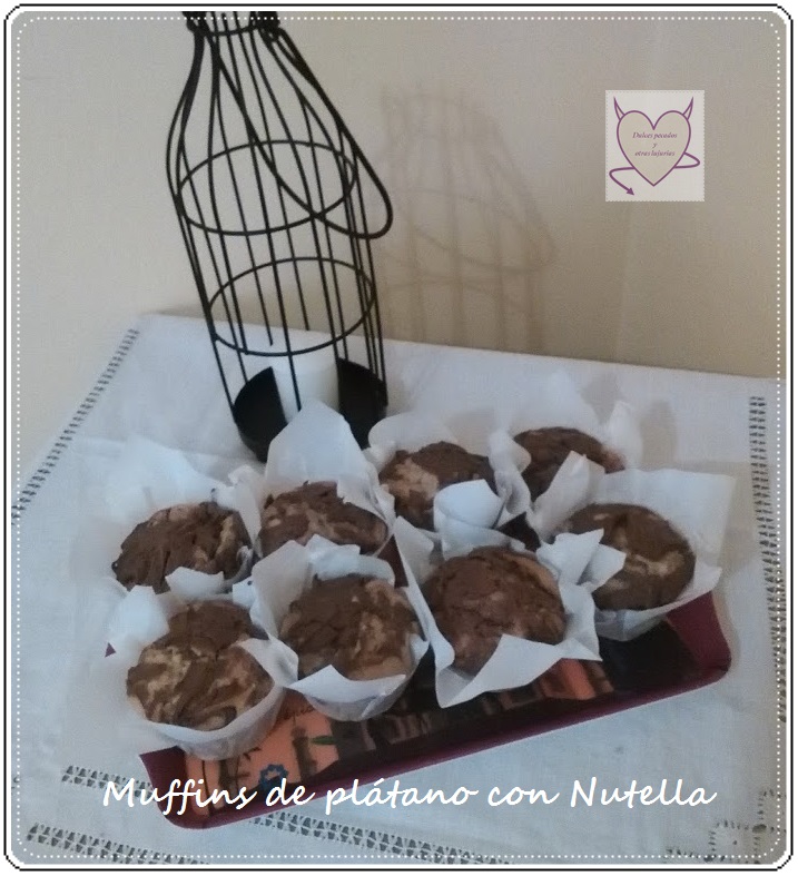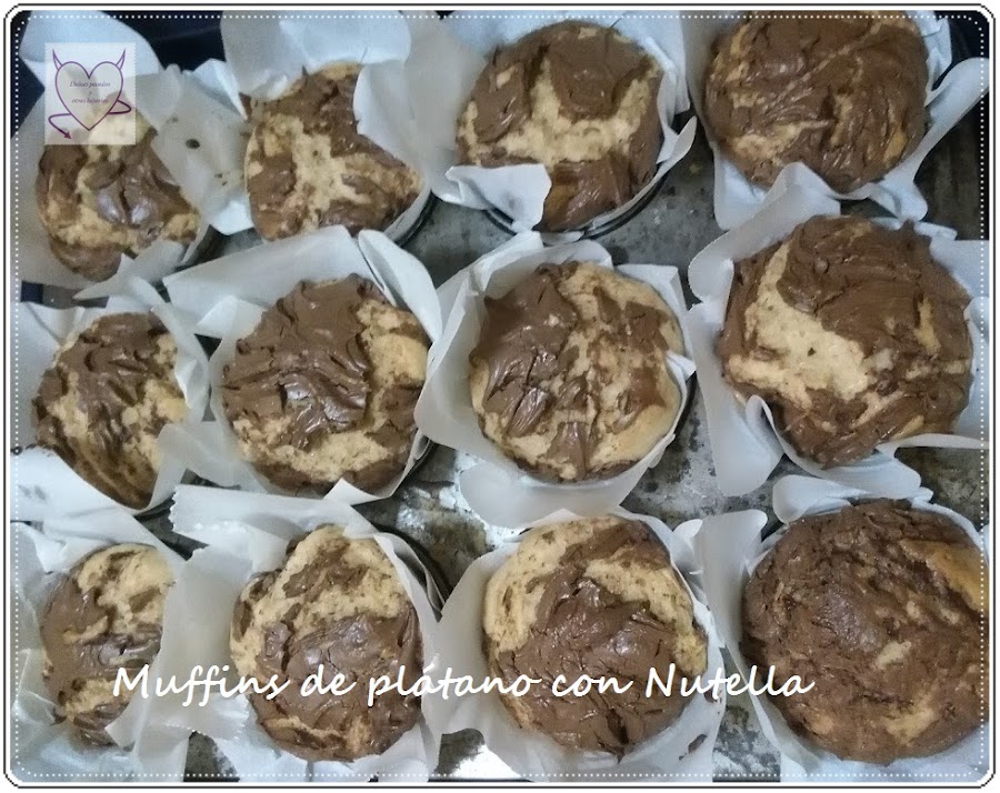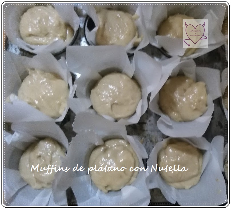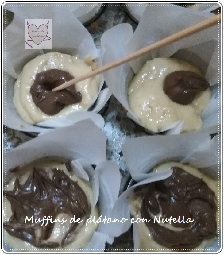 Rellenamos las cápsulas o papeles hasta 2/3 de la capacidad del molde y le añadimos una cucharadita de Nutella a cada muffin en su superficie.