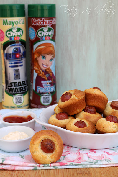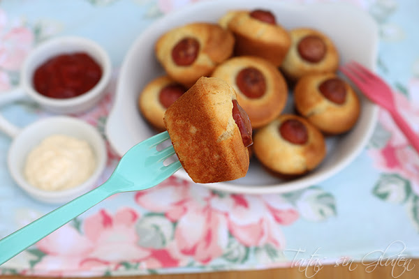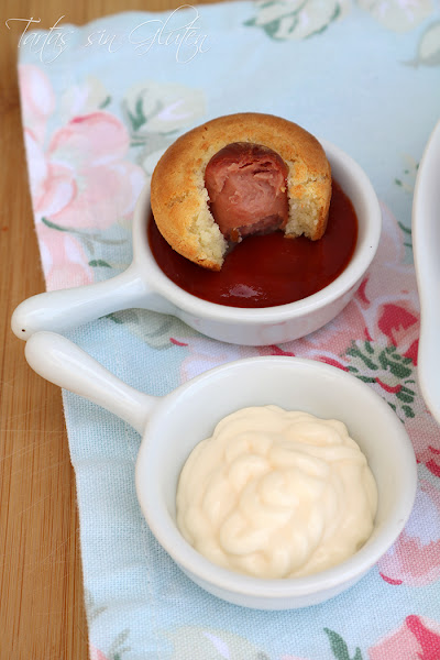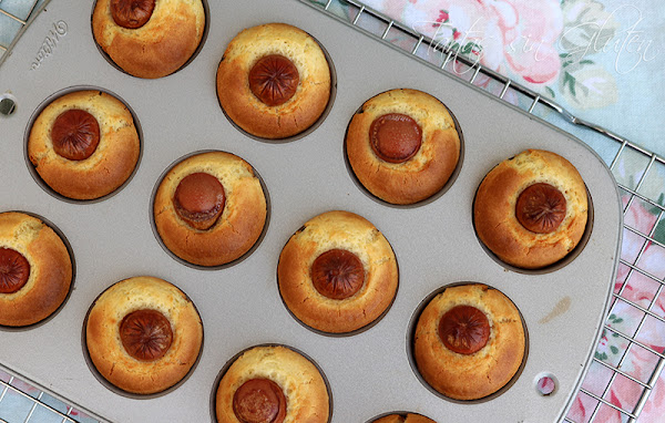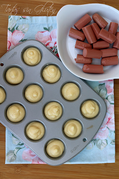Engrasar la bandeja de mini muffin y rellenarlas con la masa hasta 2/3 de su capacidad, colocar un trozo salchicha en el centro, de manera que sobresalga un centímetro.