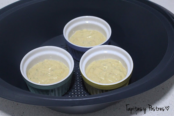 La receta es solo para tres raciones, en el varoma que es el instrumento para cocinar al vapor de nuestra thermomix solo caben 4 ramequines como los míos. Si los hacéis en horno convencional podéis doblar las cantidades y hacer seis.