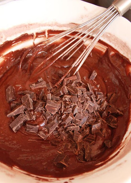 4. Agregamos el chocolate negro cortado en trocitos (reservamos una parte para echarla después) a la masa y removemos.