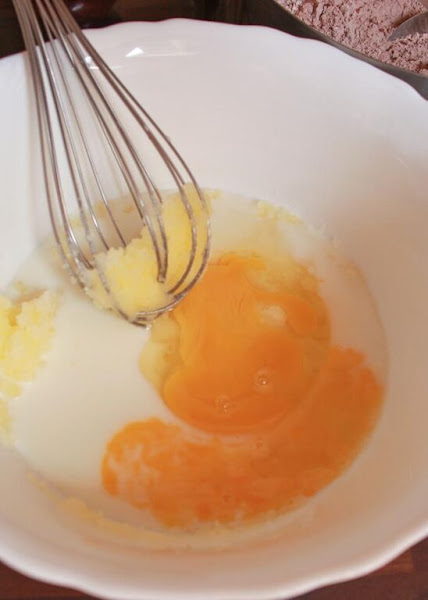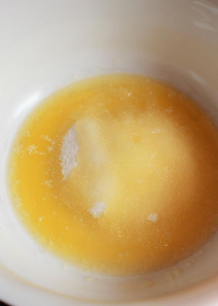 2. En otro bol, mezclamos el azúcar con el buttermilk, la mantequilla fundida y tibia y los huevos. removemos con una varilla de mano pero sin insistir demasiado. Una vez estén integrados, paramos de remover.