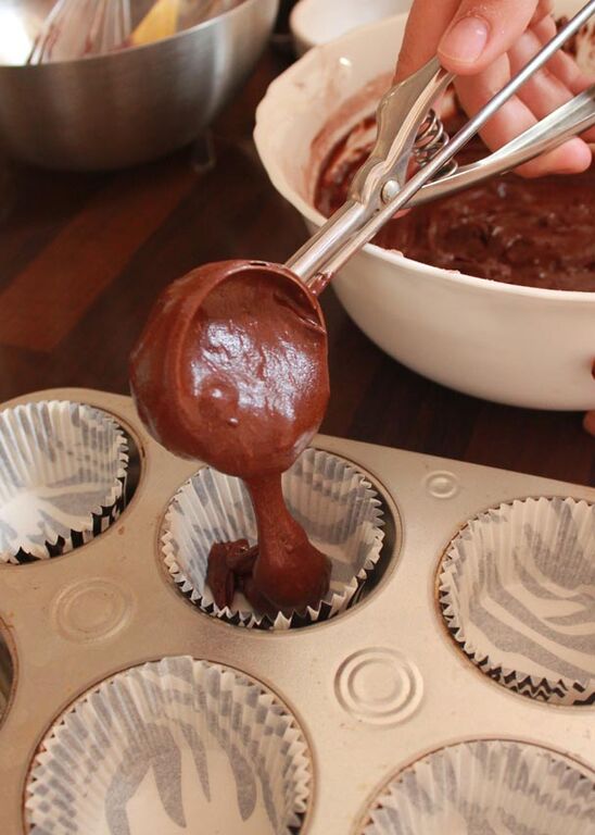 5. Preparamos un molde para cupcakes con capsulas de papel y echamos la masa en cada hueco con la ayuda de una cuchara de helados (llenamos casi hasta el borde)