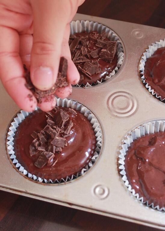 6. Ahora agregamos la parte de chocolate negro troceado reservado anteriormente en la superficie de cada muffin: