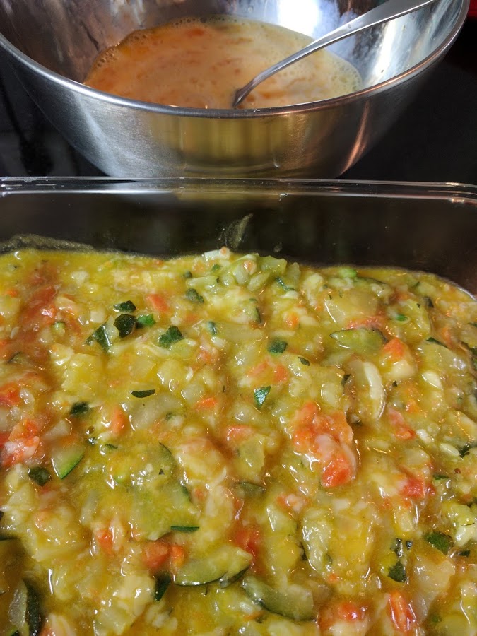 Troceamos a mano el jamón en trocitos y añadimos a la verdura. Ponemos también el queso y removemos bien. Incorporamos por último la mezcla de huevo y volvemos a mezclar.