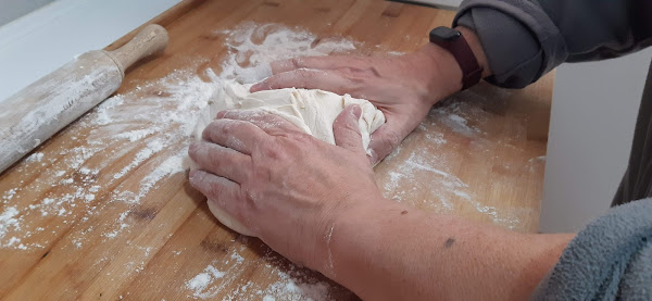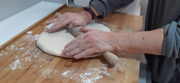 5.- Volcamos la masa en la superficie enharinada y formamos una bola que luego extenderemos con un rodillo, haciendo una lámina de 2 cm de grosor, más o menos.