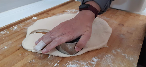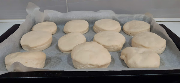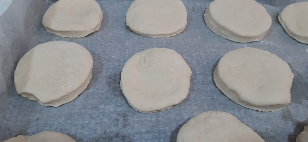 6.- Con un cortapastas, aro o vaso cortamos círculos, que iremos colocando en un bandeja de horno forrada con papel vegetal. Volvemos a cubrir con un paño y dejamos levar otra vez, hasta que doblen el tamaño.