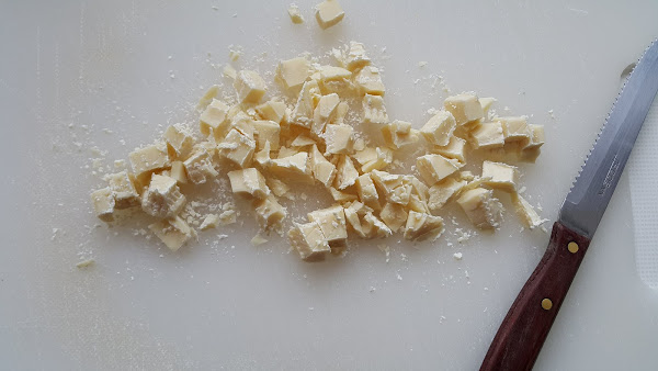 Para la decoración picamos el chocolate blanco hasta conseguir trocitos del tamaño de pepitas para poder incorporarlos a la masa.
