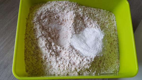 En un recipiente aparte mezclamos los ingredientes secos: la harina integral, la levadura y la pizca de sal.