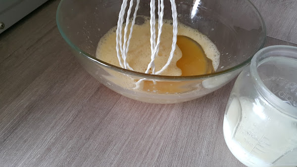 A continuación añadimos el aceite, la leche y la esencia de vainilla. Batimos bien con unas varillas.
