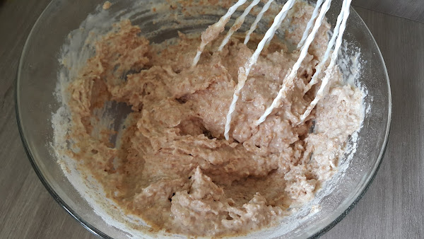 Seguidamente los vamos integrando en el bol con los ingredientes húmedos sin dejar de batir consiguiendo una masa húmeda y uniforme.