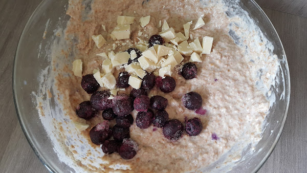 Incorporamos las pepitas de chocolate y los arándanos a la masa de los muffins, reservándonos una pequeña cantidad para color por encima una vez estén preparados los moldes.