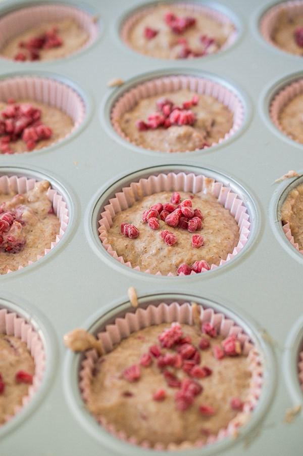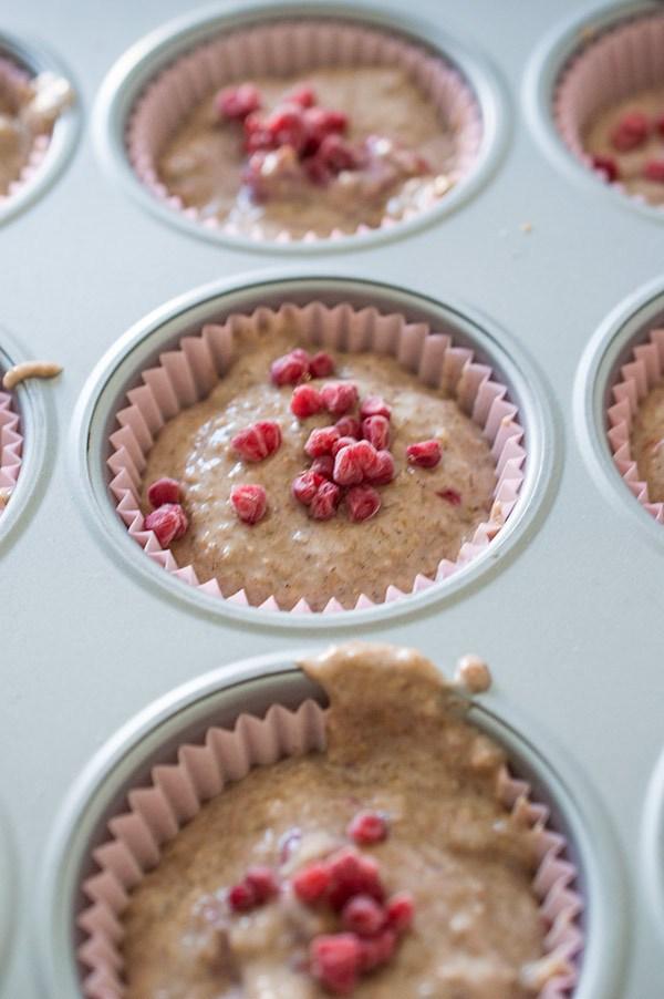 Ponemos en el molde de muffins las capsulas y rellenamos ¾ de las mismas. Partimos con las manos unas frambuesas congeladas y ponemos unos trocitos encima