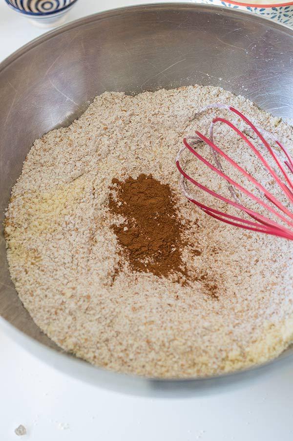 En un bol juntamos todos los ingredientes secos, la harina, la almendra, la levadura, el azúcar y la canela.