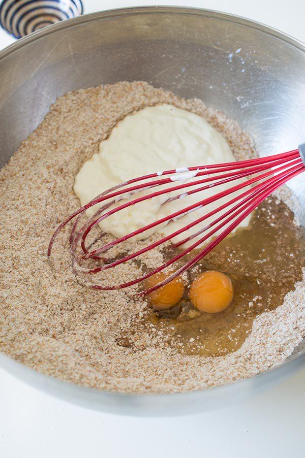 Añadimos los huevos, el aceite y los yogures, removemos bien con unas varillas.