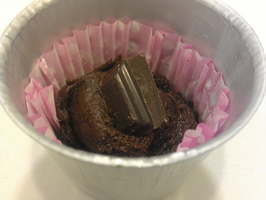 3. - Introducimos un cuarto de onza de cobertura de chocolate en cada molde y cubrimos con más masa.