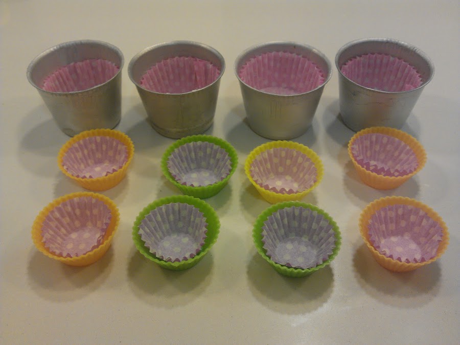 2. - Preparamos los moldes con las capsulitas, yo he utilizado las mini mini, que se utilizan para bombones o trufas...aunque también hice algunos grandes, tamaño magdalena, para comparar tamaños, y rellenamos por la mitad.