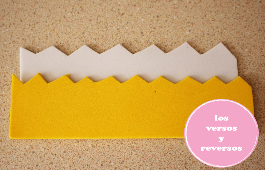 Mientras se enfrían, puedes cortar dos tiras de fomi de tres colores diferentes y con las tijeras corta la parte superior en triángulos