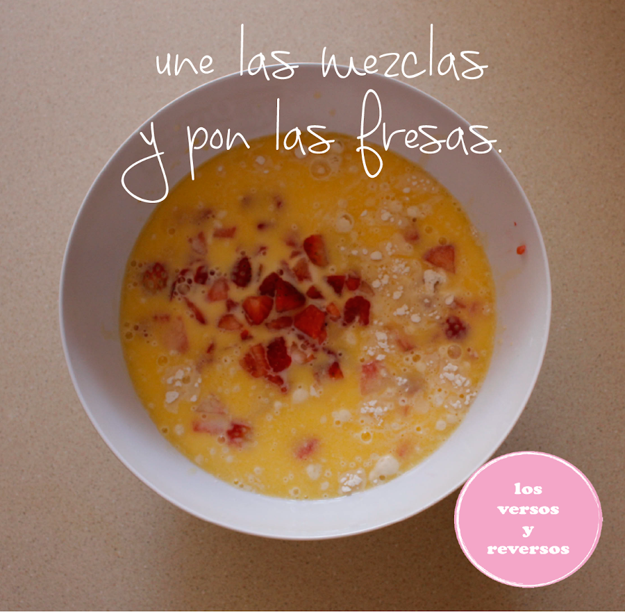 Aparte revuelve la leche, mantequilla derretida y el huevo. Una vez que esté listo, únelo a la mezcla anterior. Añade las fresas y revuelve poco. Con una cuchara pon la mezcla en los moldes sólo hasta llenar la mitad del mismo.