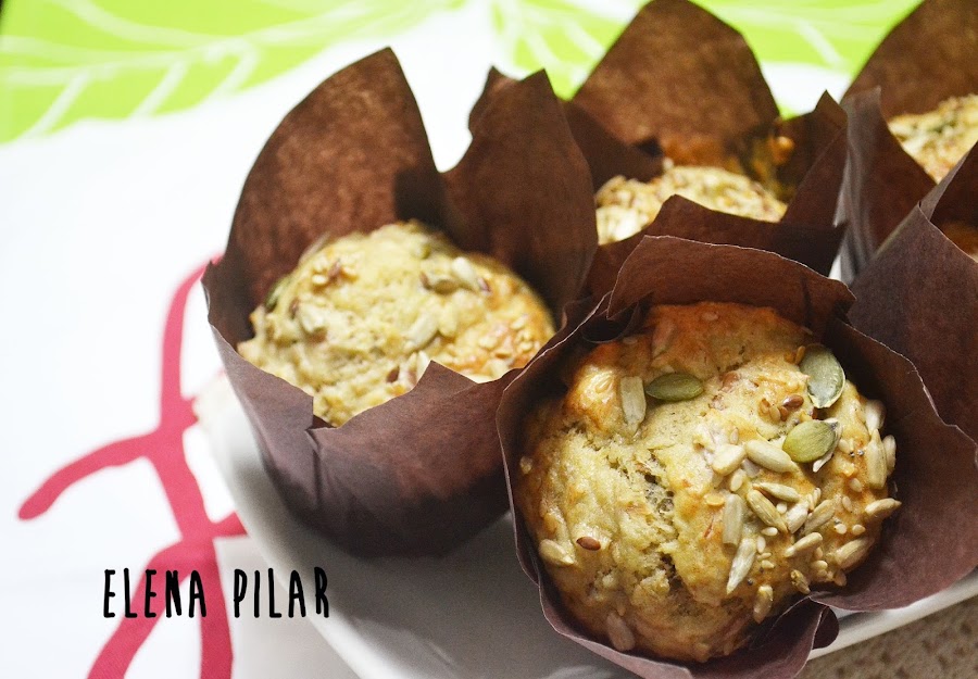 Repartitmos la mezcla entre 6 cápsulas de muffin, espolvoreamos una mezcla de semillas (la mía era de semillas de girasol, calabaza, lino, sésamo y amapola) y horneamos 25 minutos a 180ºC.