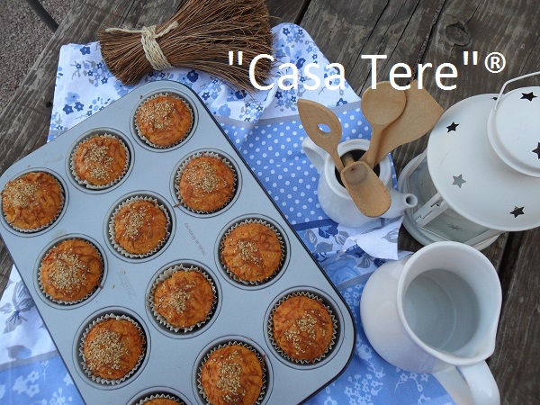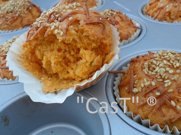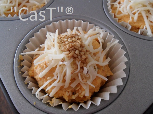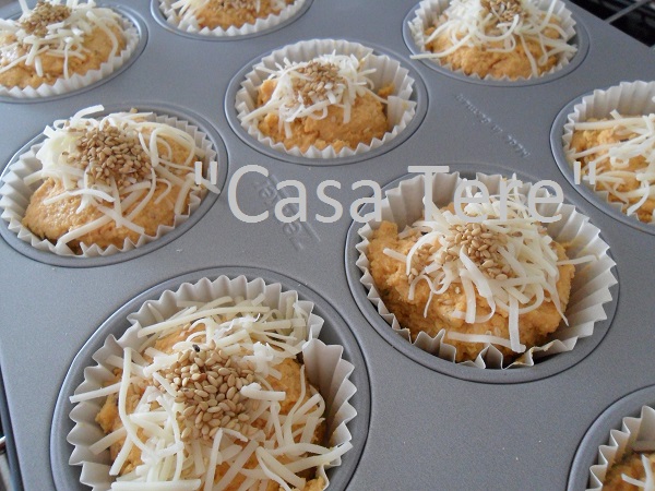 Llenamos 2/3 partes de los moldes de papel y ponemos por encima queso rallado y unas semillas de sésamo.