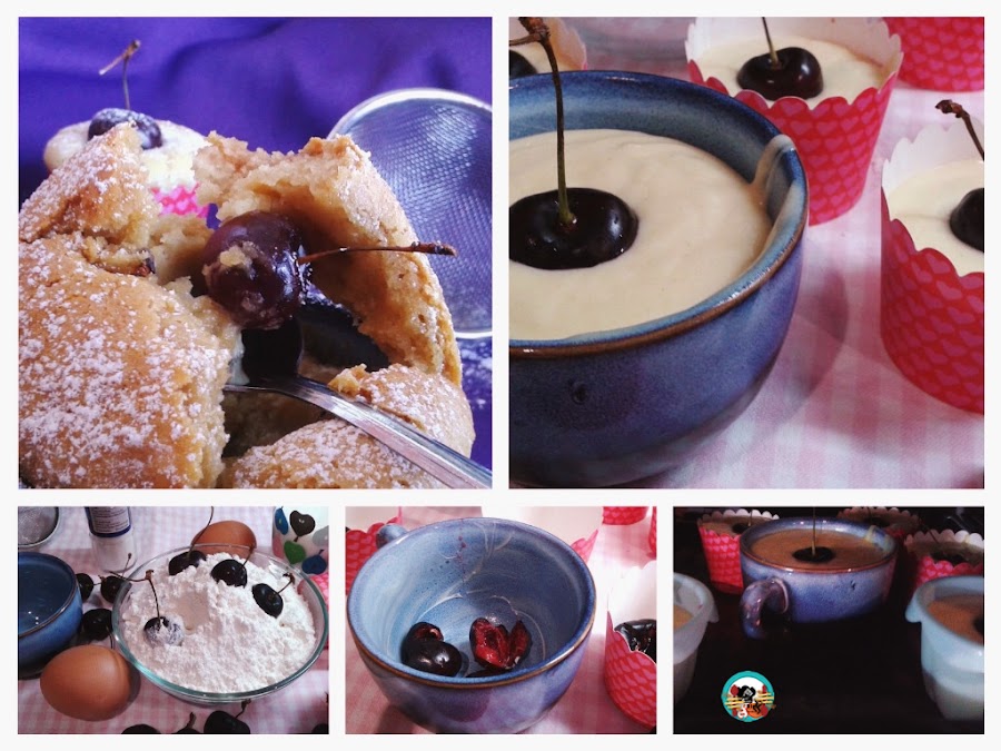 Este año me he propuesto actualizar algunas recetas que ya tengo publicada en el blog, el pasado sábado hice unos muffins de cerezas y vainilla. (Ver receta) Todavía no he corregido el post y cambiado las fotografías. Simplemente, después de preparar la masa, engrase una taza, le puse unas cereza en el fondo y la llene con la masa. Igualmente la hice en el horno 25 minutos a 180ºC. También podemos cocinarlo en el microondas a una temperatura de 70% unos 5 minutos.