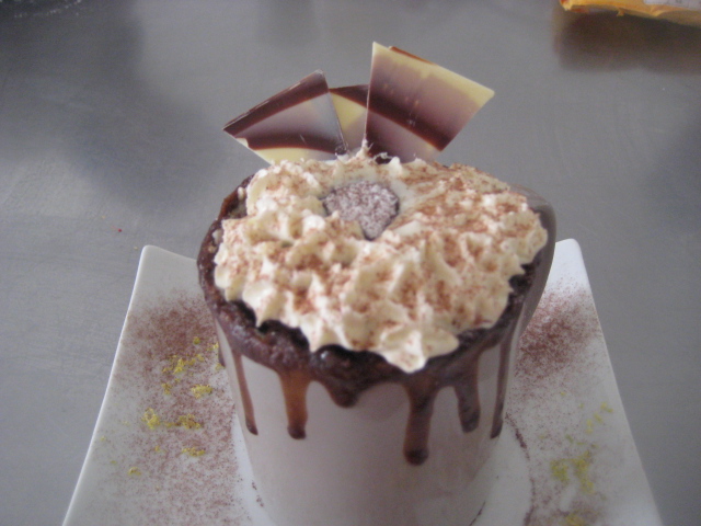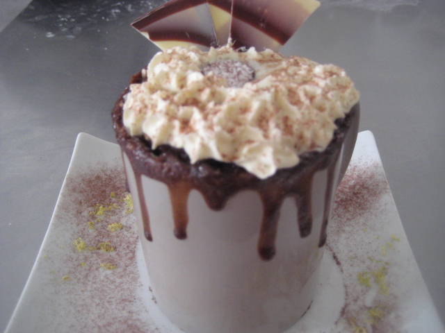 Preparación: Poner el chocolate y la mantequilla en un cuenco apto para microondas y fundirlo con cuidado a máxima potencia. Remover. Si no está totalmente fundido dejar unos segundos más. Añadir el azúcar y el huevo y batir enérgicamente. Añadir el zumo de mandarina y ralladura de limón y remover .Incorporar la harina y el impulsor y mezclar bien todos los ingredientes. Verter la masa en la taza; tiene que llegar como hasta unos 3 cm del borde. Meter la taza en el microondas —en el borde del plato, nunca en el centro. Cocer a máxima potencia 1 minuto. Bajar la potencia a 600 W, girar la taza 180º sobre sí misma y cocer durante unos 50 segundos más. Deja templar unos minutos y listo para comer. Adornar al gusto. Queda más vistoso