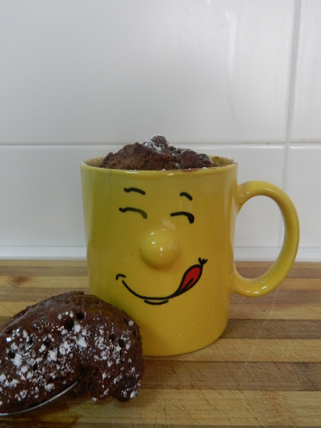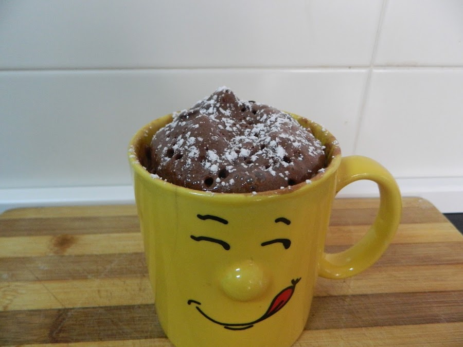 ¿Cuanto necesitamos?4 cucharadas de harina, 5 cucharadas de azúcar, 3 cucharadas de cacao en polvo, 1 huevo mediano, 3 cucharadas de mantequilla, 3 cucharadas de leche, 1 cucharada de nueces y 1 cucharada de pepitas de chocolate