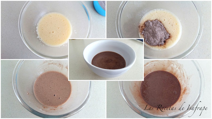 Vamos incorporando cucharada a cucharada el preparado reservado de cacao, mezclando cada vez.