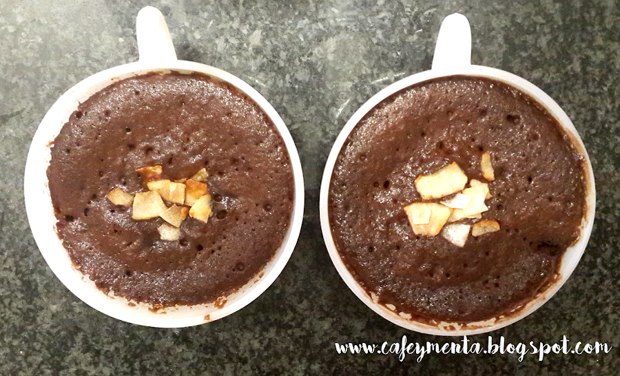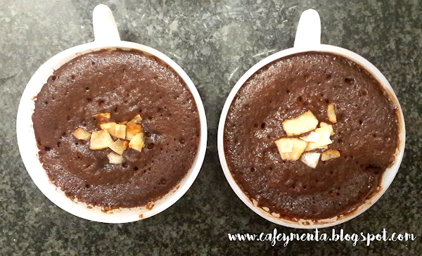 5. Para cocinar el mug cake, hay que poner las tazas en el microondas de manera que no estén en el centro, y con las asas mirando hacia fuera. Ponemos el microondas a 800 W durante 1 minutos. Veréis que ya ha subido bastante, pero habrá que darle una segunda tanda. Ahora colocamos las asas de la tapa hacia dentro, y ponemos el microondas durante 30 segundos. Y... ¡Voilà!