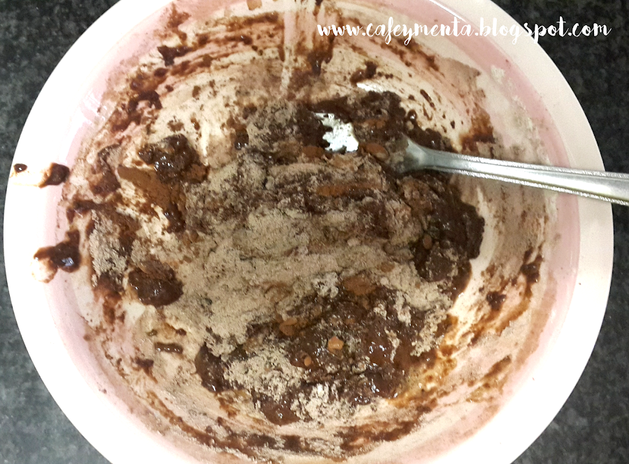 1. En un bol mezclamos el harina, la levadura, el cacao en polvo y el azúcar. Removemos bien con la ayuda de una cuchara.