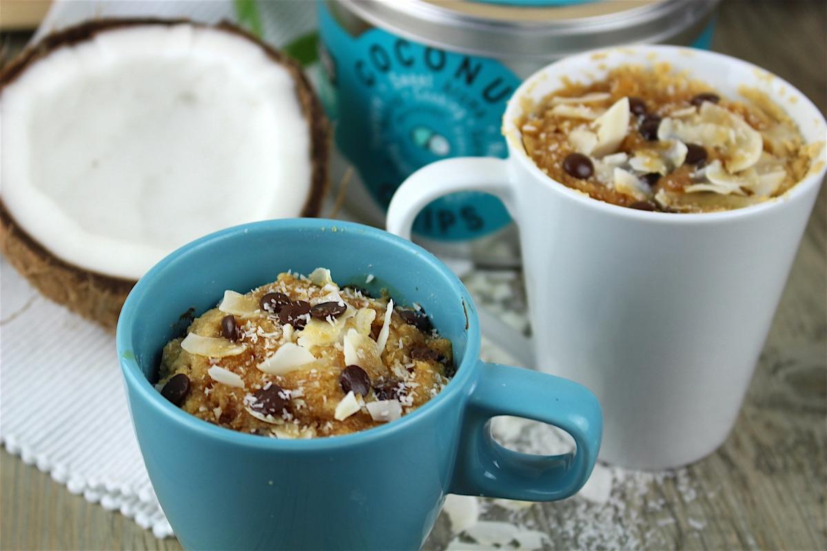 Mug cake de coco y chips de chocolate (sin gluten y sin leche)