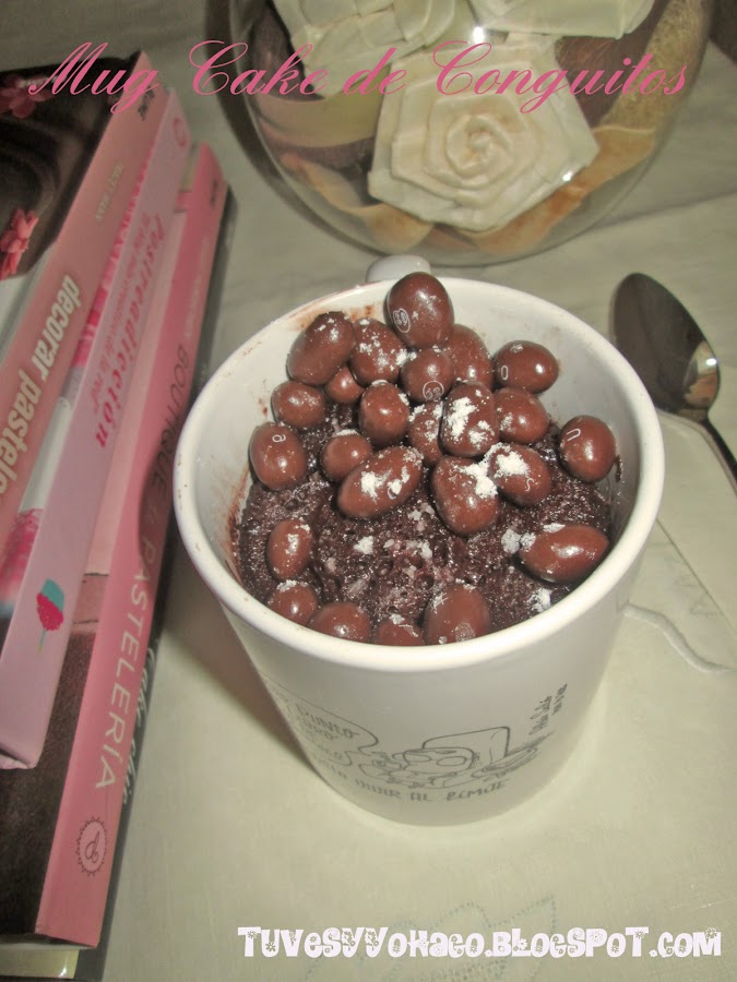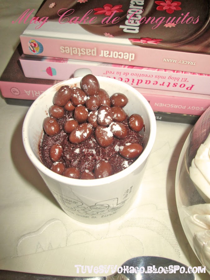 5. Añade un puñadito de conguitos y haz el mug en el microondas a máxima potencia durante 1 minuto y 20 segundos (en mi microondas ese es el tiempo necesario para que el bizcocho salga con la textura que hay en la foto).