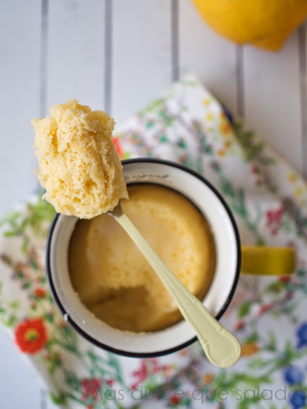 Pero de momento vamos con este riquisimo mug cake de limón, con mucho sabor y una miga muy esponjosa como podéis ver en las fotos. De todos los mug cakes que he hecho hasta el momento, este ha sido el que más ha aguantado el paso del tiempo, de todas formas como más rico está es recién hecho.