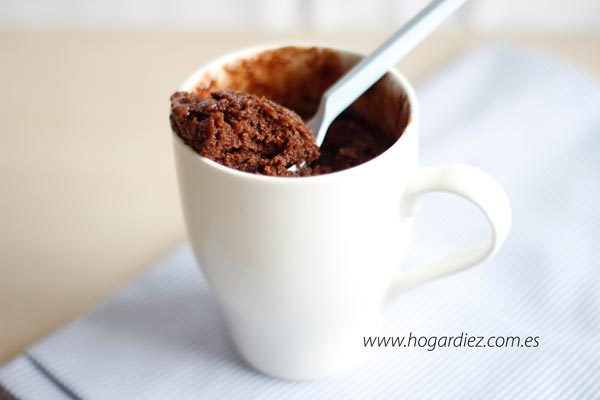 Te recuerdo que los mug cakes, te los tienes que comer en cuanto los haces y que terminan de cocerse una vez han salido del microondas. Así que en cuanto se enfríe un poco, ya podrás incarle el diente, precisamente para eso están pensados, para que sea dicho y hecho. Por cierto te recomiendo comerlo con cuchara.