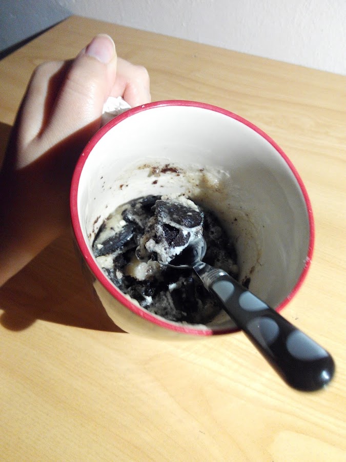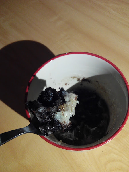 Mezclamos todos los ingredientes, salgo las oreo, hasta que quede una masa homogenea. Lo podemos hacer en la misma taza que vayamos a usar.