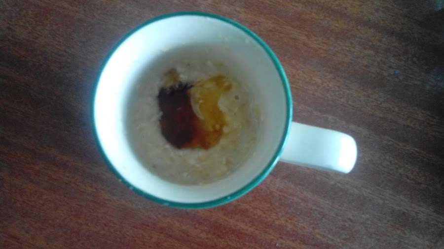 Espolvoreamos por encima 1/2 cucharadita de azúcar morena y 1/2 cucharadita de canela en polvo y metemos al microondas por 1 minuto o 1 minuto y 15 segundos. Primero lo colocamos 30 segundos, luego otros 30 segundos y por último, si es necesario los 15 segundos adicionales.