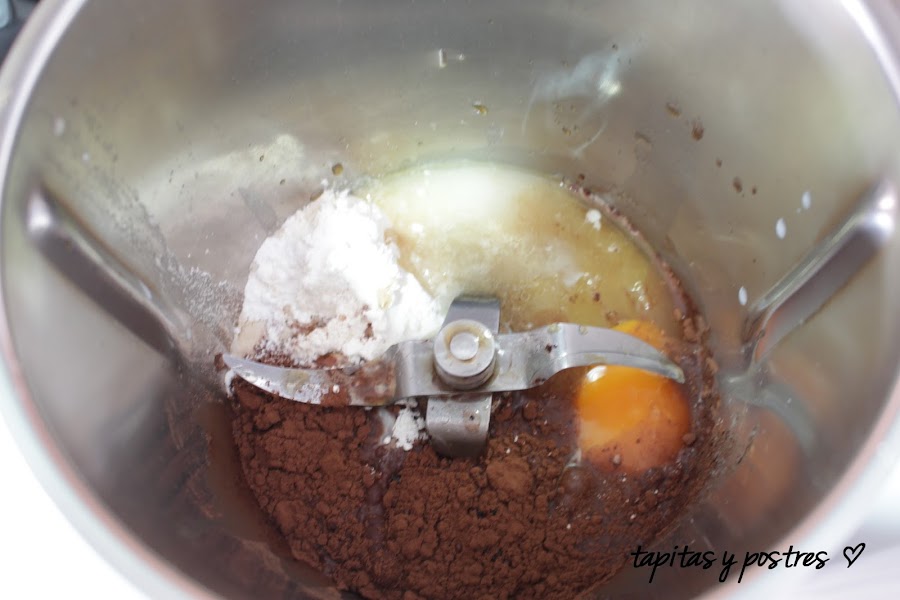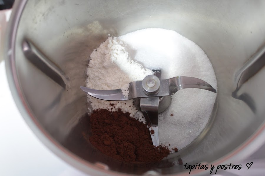 Ponemos en el vaso de la thermomix la harina, azúcar, cacao...