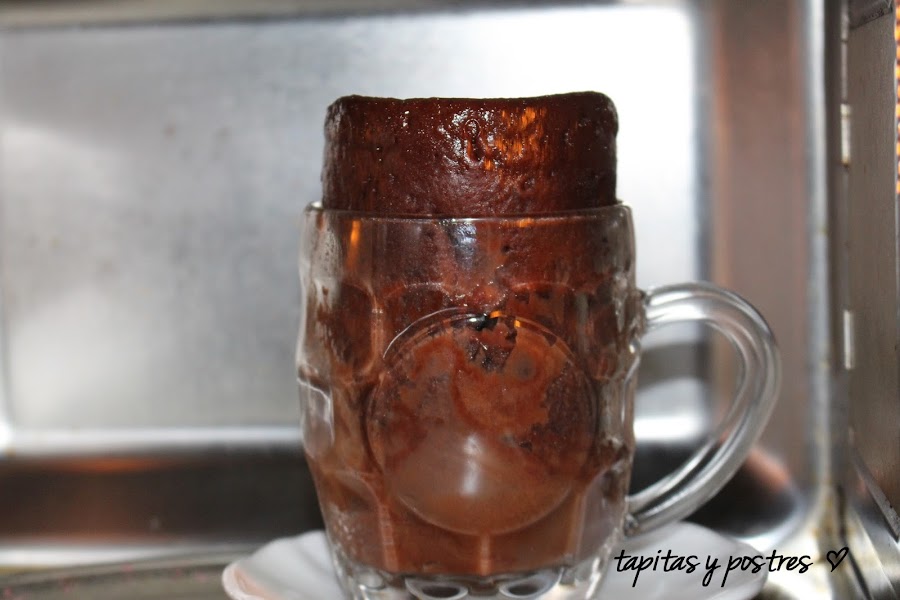 Vertemos la mezcla en el recipiente elegido, que debe ser apto para el micro. Yo he elegido una jarra de cerveza para darle más verosimilitud al dulce. No llenéis hasta arriba del todo, dejad un par de de dos. Metemos en el micro, dos minutos y medio