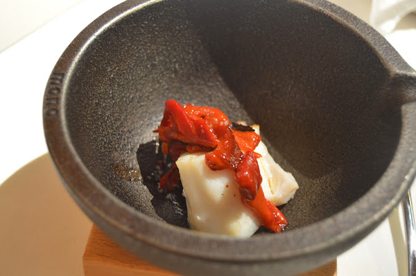 Pescado a la parrilla y esencia de vaca. Tan simple y tan genial, merluza? lubina? no lo recuerdo, pero con ese pimiento rojo quedaba espectacular. Los productos en su máxima pureza, con todo su sabor y sin más vueltas.