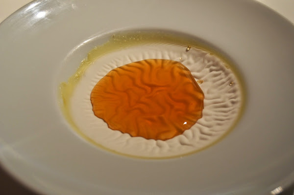 Ideas amargas de terciopelo. Descubrimiento: era como comer la piel de un Brie o un Camembert, dura y algo gelatinosa pero con el sabor de queso azul. Nos explicaron que se creó inyectando bacterias, no es un gran plato pero es muy interesante.