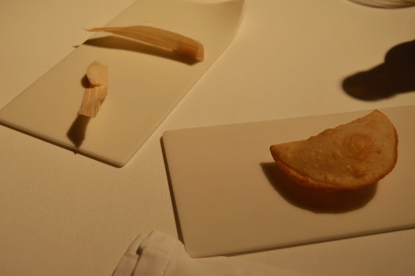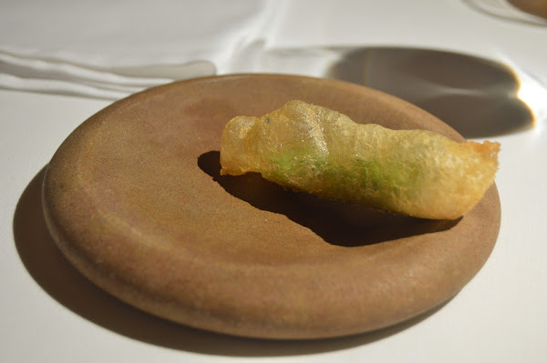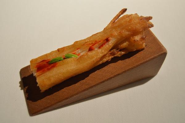 Espárrago con esencia de carabinero. Esta cosa tan simple era brutal, aunque algo incómodo de comer porque era duro e filoso. Un esparrago blanco frito, con unas gotas de esa esencia de marisco, aun tengo el sabor en la boca de ese toque salado.