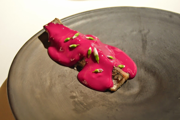 Verdel remolacha y rábano. Ácido y electrizante pero con el gusto potente y graso del verdel, me gusto mucho la mezcla de sabores, a mi #compañeroculinario no le gustó, por la textura de la salsa y por el color rosa barbie.