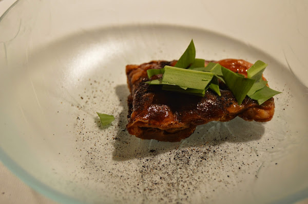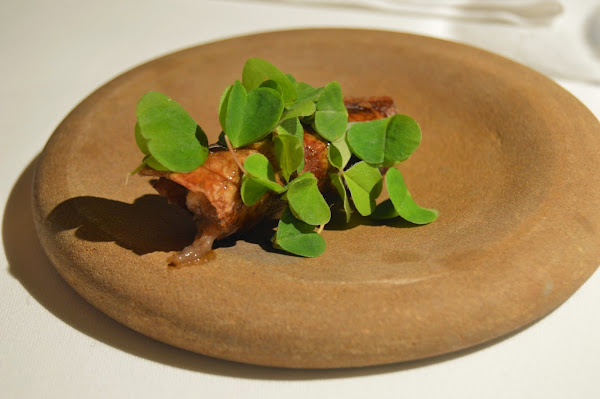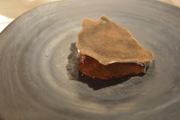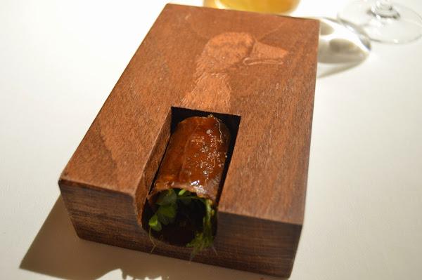 Cuello de pato lacado con su jugo, hierbas de la huerta y grano seco. Piel de pato cilíndrica, crujiente y saborisisima, rellena de brotes y plantas, con un intenso gusto a pato, muy interesante. Más tarde viendo las fotos me entero de la metáfora: Es la alimentación de un pato: las hierbas y el grano (de maíz).