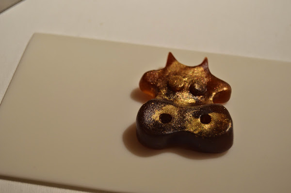 Crema de chocolate y jamón. Un hueso hecho de azúcar (aunque no se come), con sabor a jamón, total! Y con una lágrima de ganache de chocolate. Pff, que sabores...