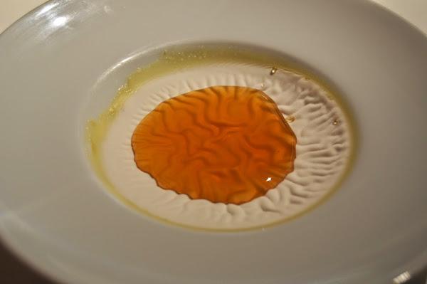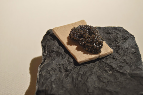 Chufa con caviar. Me encantó... La galleta era una masa fría de almidón de chufa, un resultado parecido al que se obtiene al mezclar maicena con agua: denso, pastoso, desagradable en boca, harinoso.