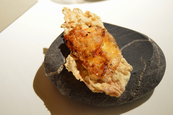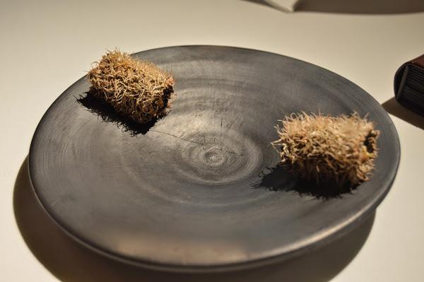 Cordero asado al incienso de eucaliptos y su pelliza seca. Delicioso y terroso, una clavada imitación de la piel de cordero comestible, buenísimo.