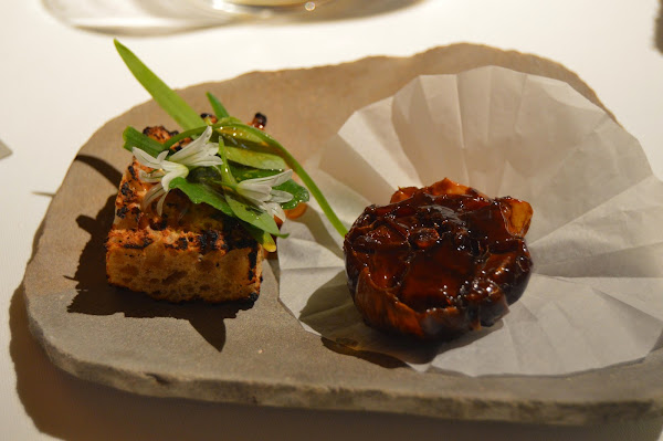Ail Glacé. Un pan tostado (que era espectacular) con flores y hierbas y un ajo glaseado, había que frotarlo con el pan. Estaba perfectamente confitado y había perdido la fuerza peculiar del ajo.